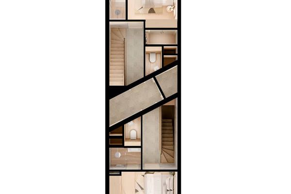 Een centrale gang op de tweede verdieping biedt toegang tot de duplex-appartementen. Via de hal, met aansluitend een slaapkamer met badkamer, bereik je per trap naar boven de doorzonverdieping. Hier ligt de doorzonverdieping dus op de derde etage.
